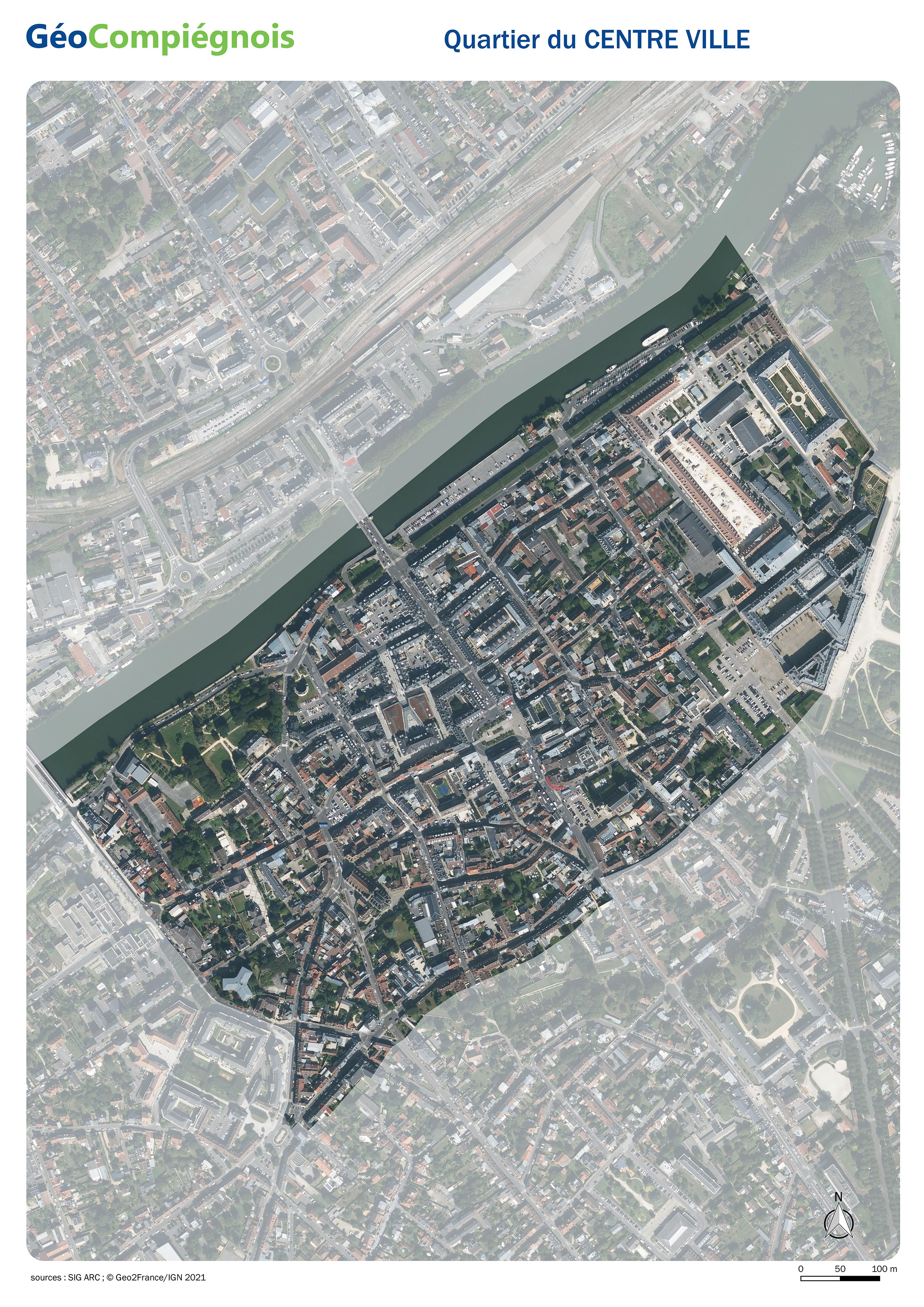 Orthophotoplan 2021 du quartier du Centre Ville à Compiègne.