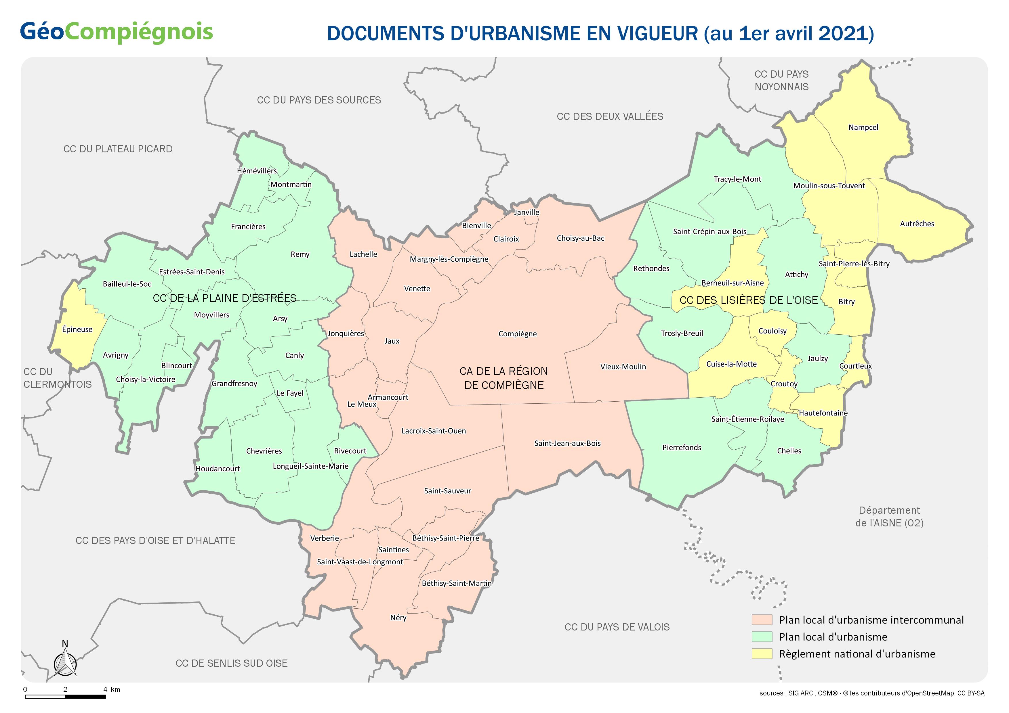 Carte présentant les types de documents d'urbanisme en vigueur (au 1er avril 2021) sur les collectivités du Pays Compiégnois