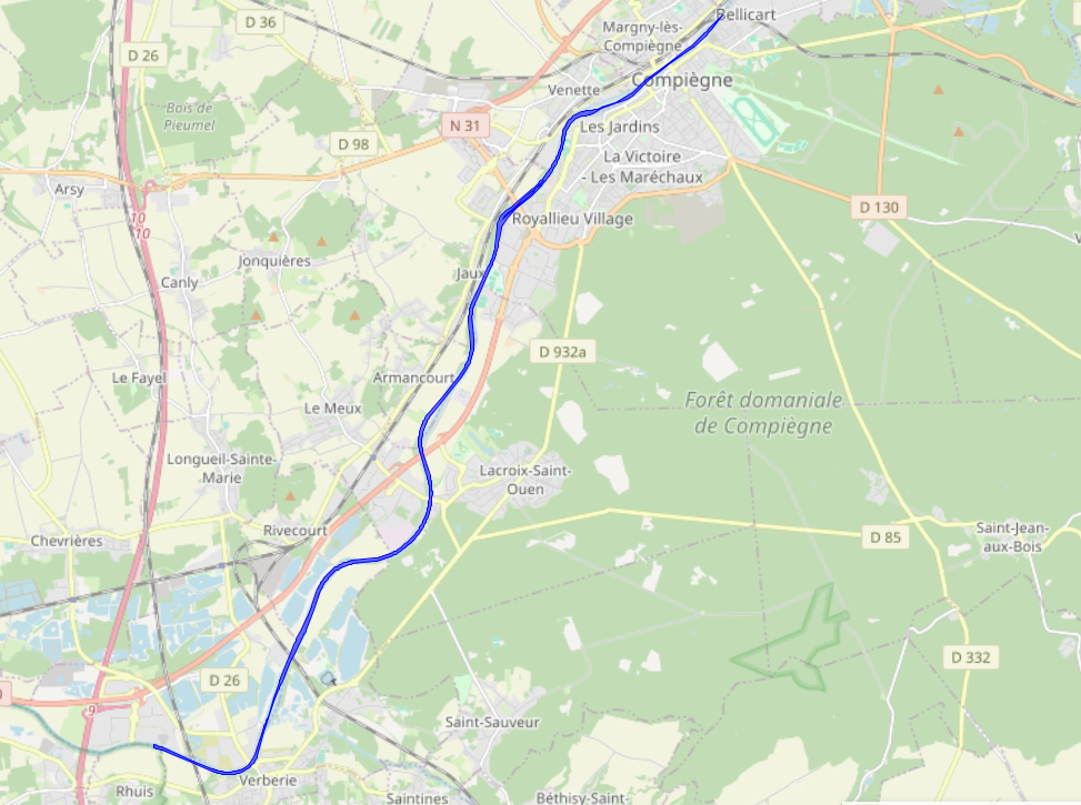 Le projet de Mise Au Gabarit Européen de l’Oise (MAGEO) entre Compiègne et Creil est porté par Voies navigables de France en tant que maître d’ouvrage. Ce projet a pour objectif de garantir un mouillage de 4 mètres (contre 3 mètres aujourd’hui) entre Compiègne et Creil, afin d’accueillir des convois gabarit européen Vb transportant jusqu’à 4 400 tonnes de marchandises. Ce projet se situe au débouché sud du canal Seine-Nord Europe, maillon central de la liaison fluviale Seine-Escaut. Il s’étend sur 42 kilomètres de linéaire, depuis le pont SNCF de Compiègne jusqu’à l’écluse de Creil, et traverse 22 communes dans le département de l’Oise. Cette ressource contient le tracé du futur chenal de navigation.