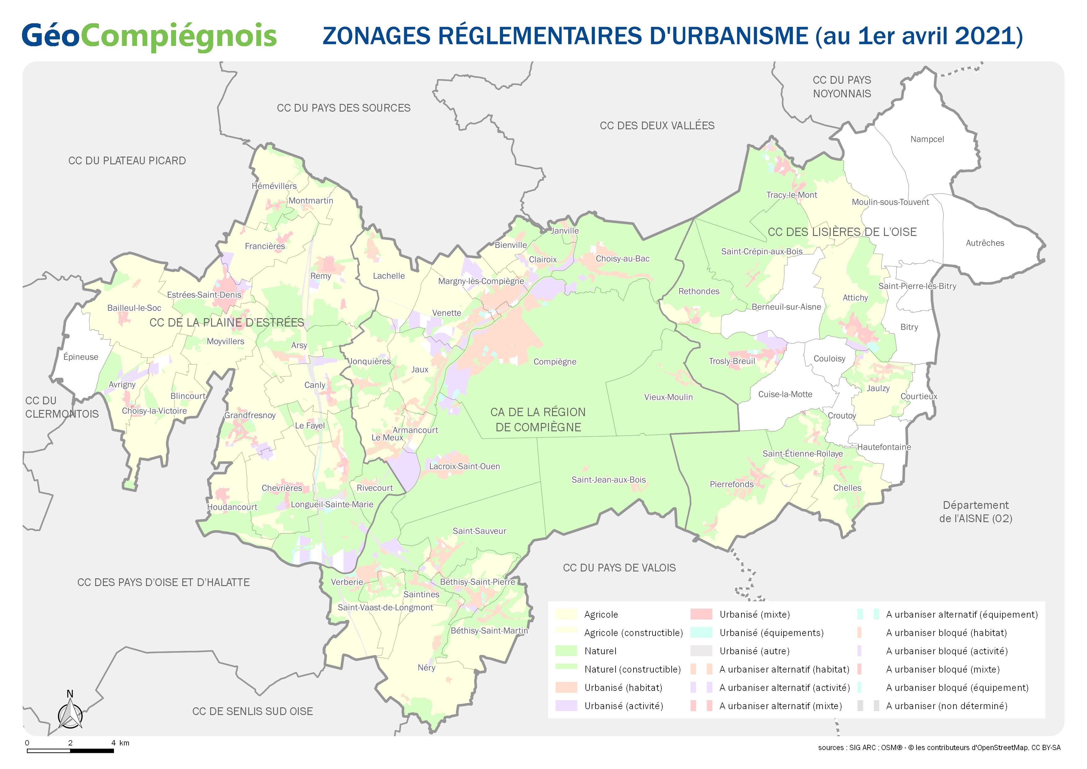 Vue d'ensemble des zonages réglementaires (au 1er avril 2021) des documents d'urbanisme en vigueur des collectivités du Pays Compiégnois.