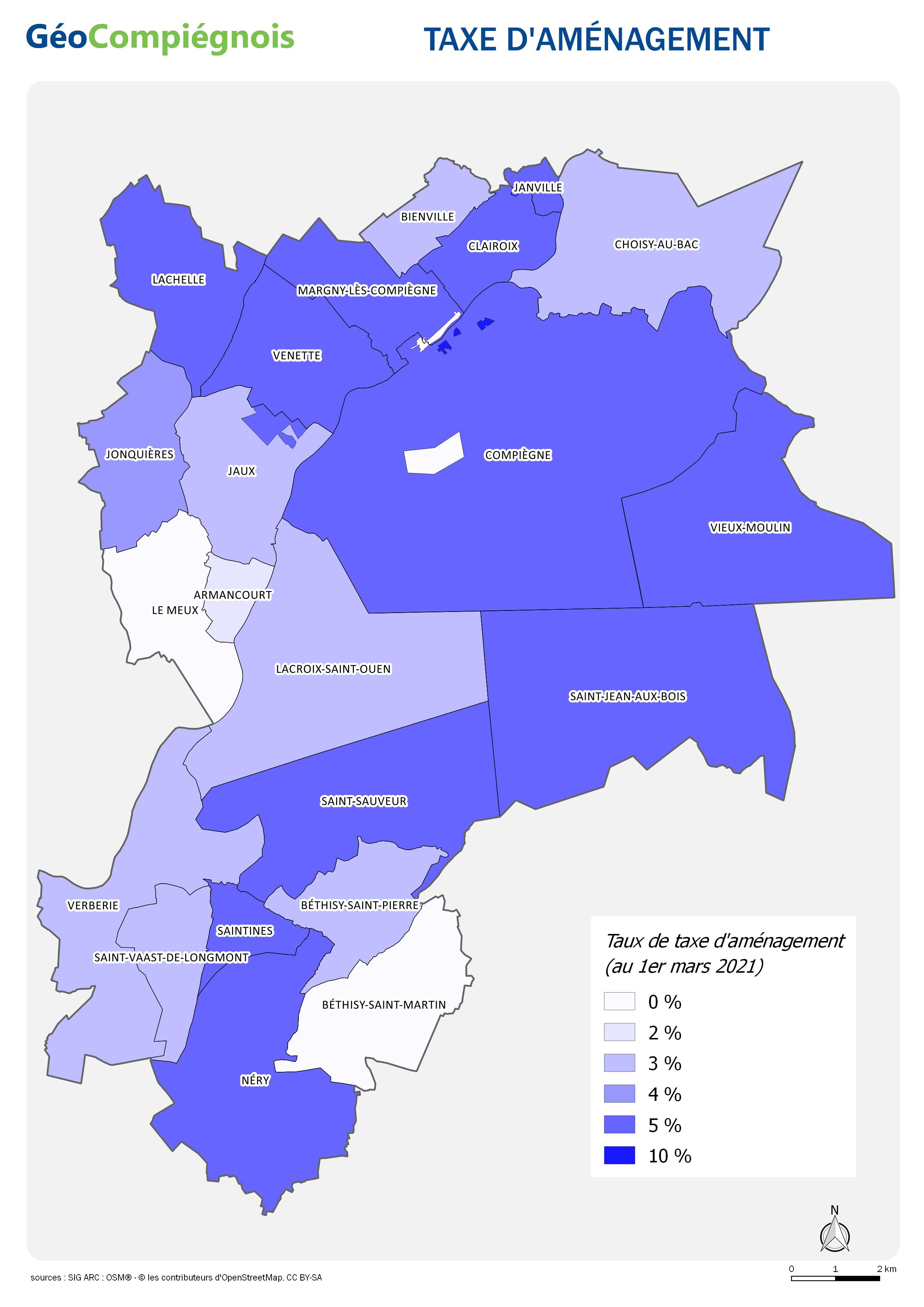 Carte illustrant le taux de taxe d'aménagement mis en place sur les communes du territoire de l'Agglomération de la Région de Compiègne.